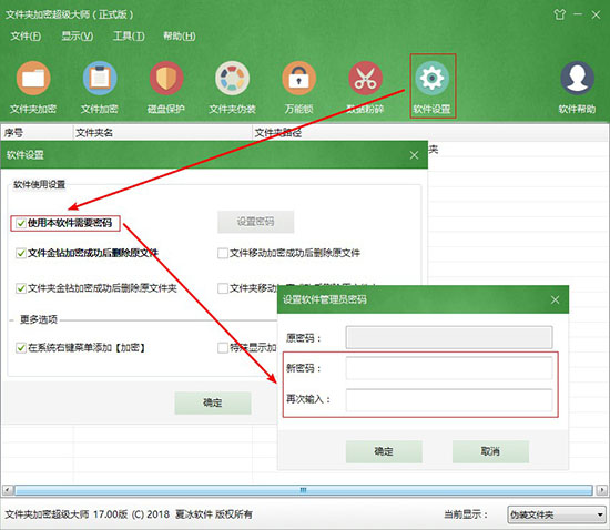 設(shè)置方法:打開文件夾加密超級大師,點(diǎn)擊軟件設(shè)置。在軟件設(shè)置里窗口勾選“使用本軟件需要密碼”選項(xiàng),在彈出的密碼設(shè)置窗口中設(shè)置密碼。如需取消此密碼,將“使用本軟件需要密碼”選項(xiàng)的勾取消即可。