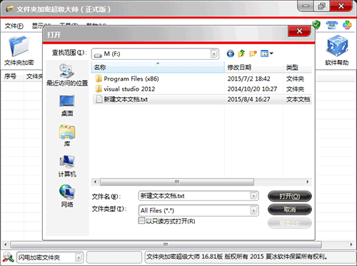 2、給文件加密時,您只需要點擊軟件功能區(qū)的文件加密按鈕,然后在彈出的窗口中選擇需要加密的文件。
